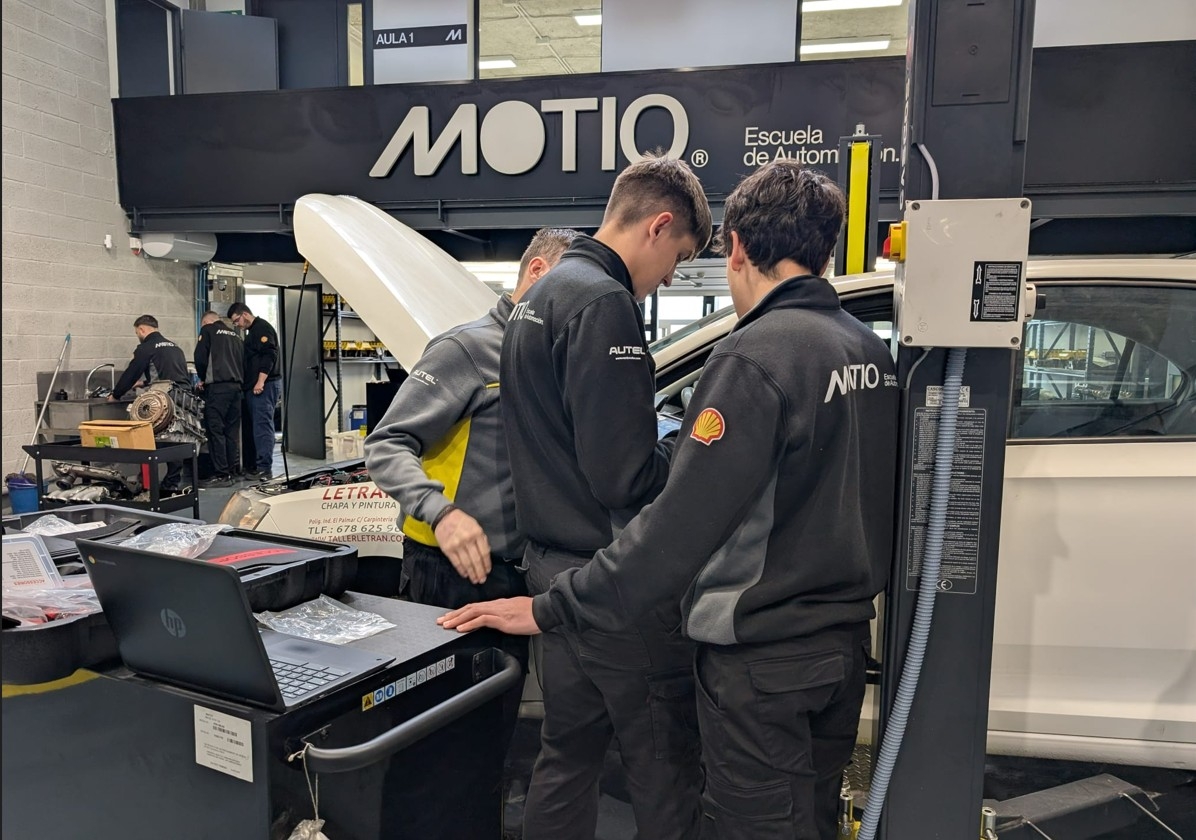 La “A” significa “aprender haciendo”. Y eso sólo es posible disponiendo de medios técnicos, de los que en Motio abundan. Un ejemplo ilustrativo: la escuela cuenta con diez máquinas de diagnosis, aportadas por Autel. Y los contenidos técnicos se combinan también con otras asignaturas como inglés, sostenibilidad, etc.