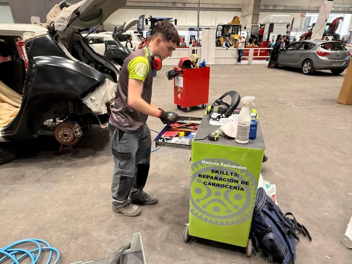 Un puñado de metros a la derecha, está Marcos Fernández. Las estelas de su camiseta y cajón de herramientas le delatan. Es el campeón de Cantabria en carrocería y, como tal, representa a la comunidad montañesa en este SpainSkills. Con 20 años ya está trabajando en Talleres Pacheco, en el municipio de Heras, junto a Peña Cabarga, esos riscos que dan fondo al precioso paisaje de la bahía de Santander. Precisamente, en la capital, ha completado dos grados medios. En el Centro Integrado número 1, estudió dos años de electromecánica y, luego sumó uno más en la misma materia y otro más, en carrocería. Fue este último el que le cautivó.